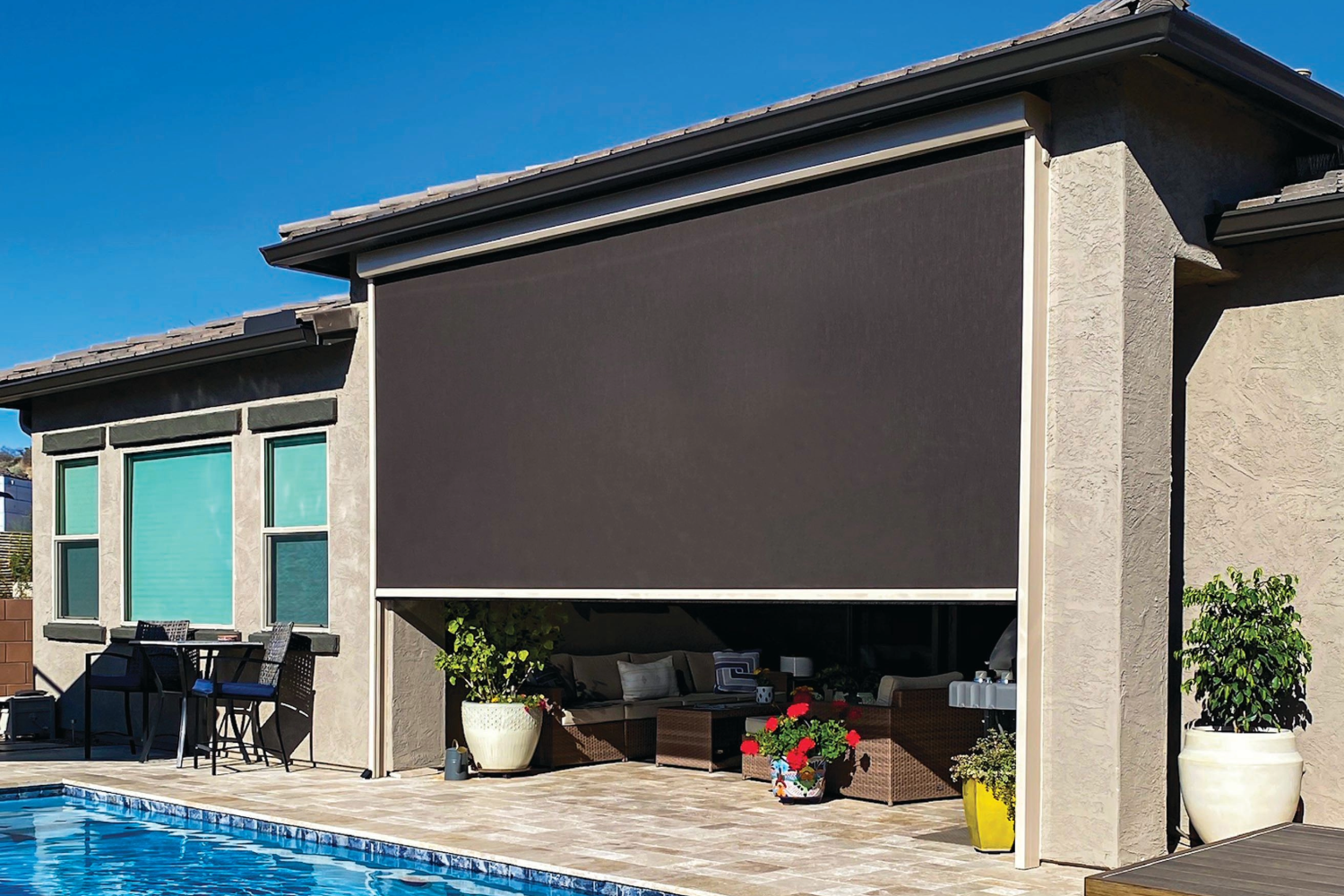 These screens are designed to withstand harsh desert conditions while maintaining outward visibility. For homes with large south- or west-facing windows, exterior solar screens can dramatically improve indoor comfort during peak sunlight hours.